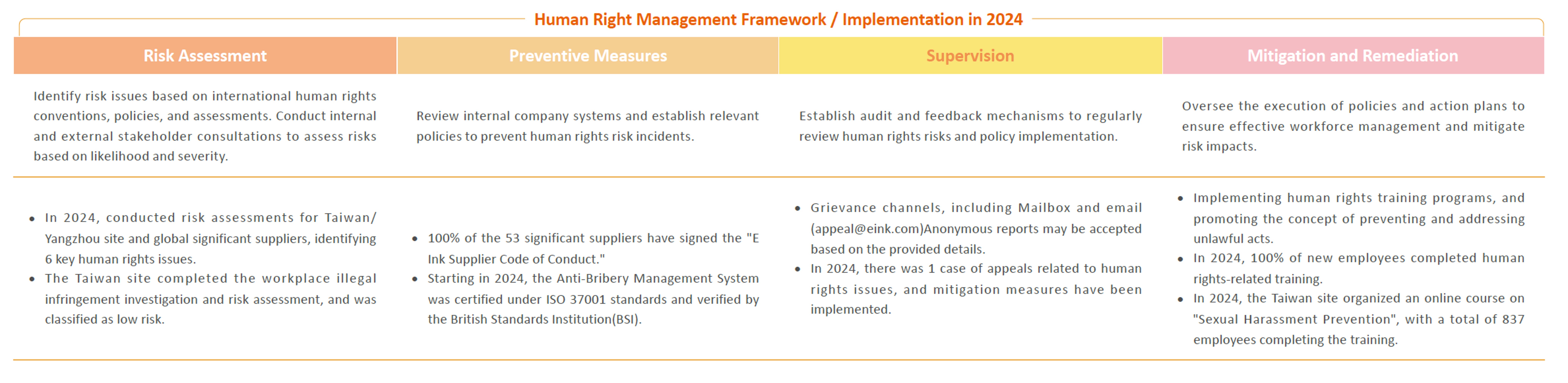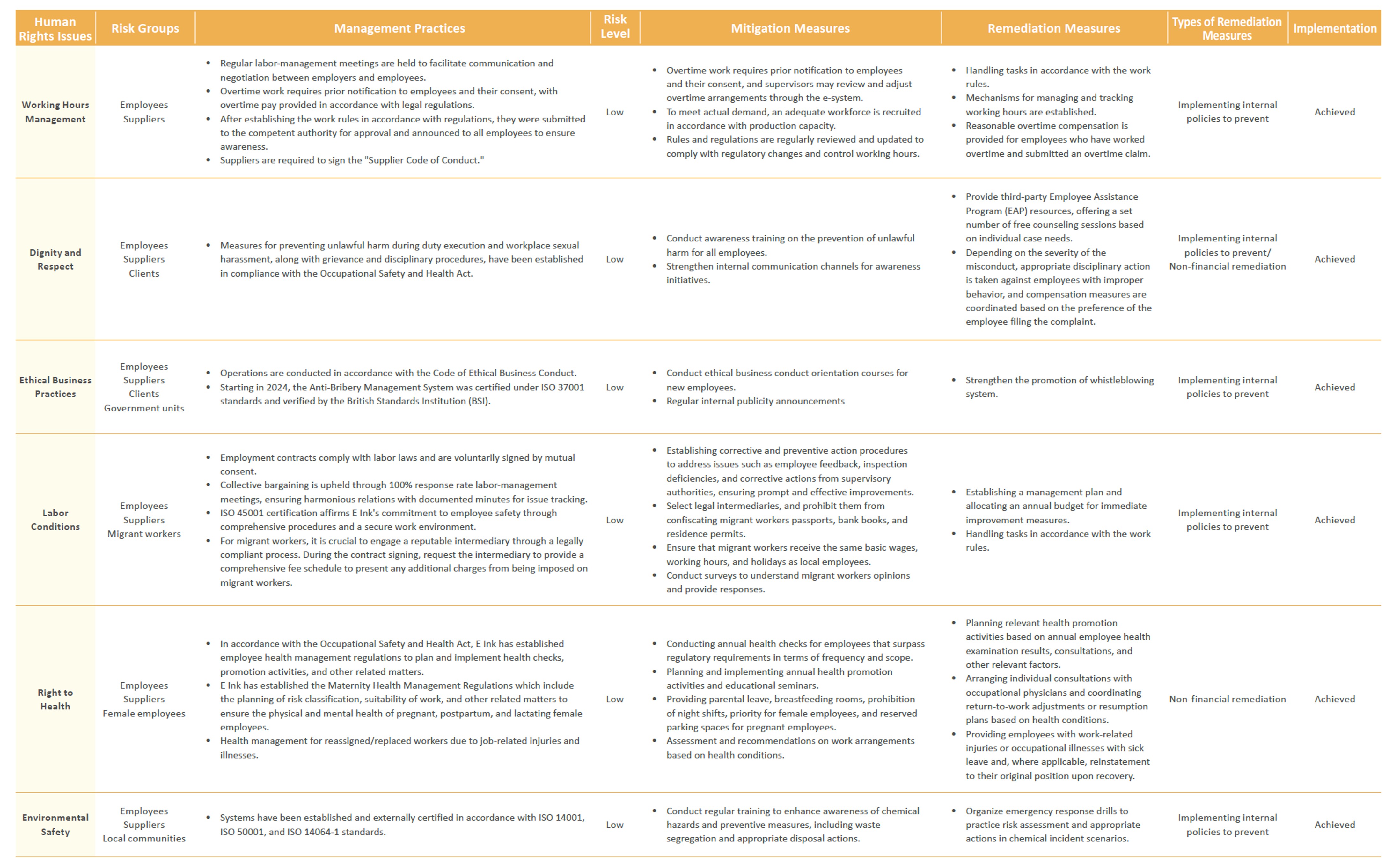 10. We may review and assess related risks, practices and effects to cope with changing situations and meet the requirement of the stakeholders. E Ink, in its employee recruitment, management, and development practices, strictly complies with the Labor Standards Act and is also committed to upholding human rights policies. In the event of mass layoffs or organizational restructuring, the Company is committed to adhering to international human rights standards and local labor regulations. We will provide at least 60 days’ prior consultation or notice before implementation to ensure that affected employees receive adequate information, fair compensation, and necessary support services, thereby assisting them in making a dignified transition and mitigating adverse impacts on their families and society.