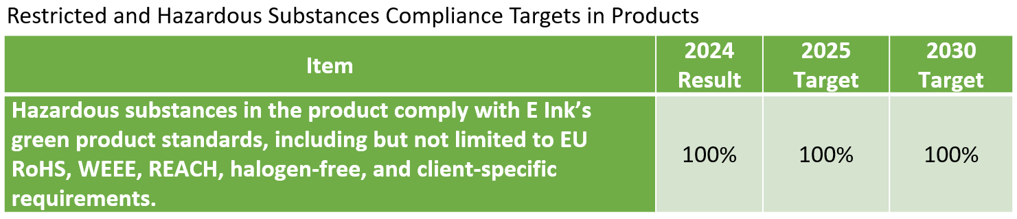 In 2021, E Ink's "Environmental Restricted Substances Management Committee" established the "Green Product" management guidelines, implementing comprehensive control over all components through the restricted and hazardous substances management process. In addition to regularly holding meetings and reviewing operations to ensure that management standards remain up-to-date, the committee also evaluates customer requests or changes in international restricted and hazardous substance regulations, adjusting control standards and operational modes as needed, and notifying relevant departments through announcements. If restricted substances are found in products, a phased-out or substitution will be developed.