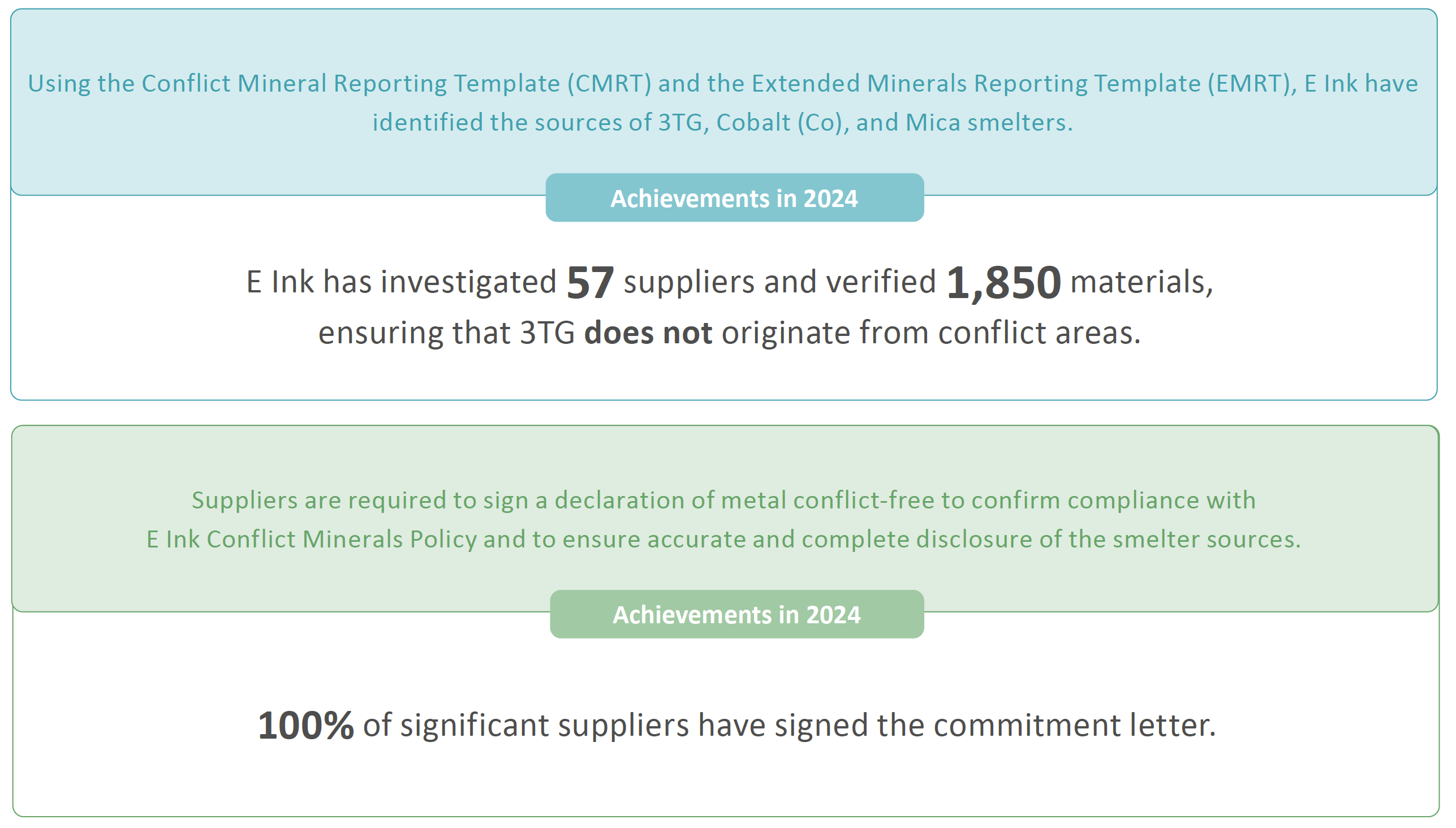 Note: All raw materials must comply with E Ink's restricted substances management regulations. E Ink may require material suppliers to provide and update third-party certified restricted substances test reports, and also conducts annual sampling tests of materials for restricted substances through a third-party certified body to ensure compliance with its restricted substances management regulations.