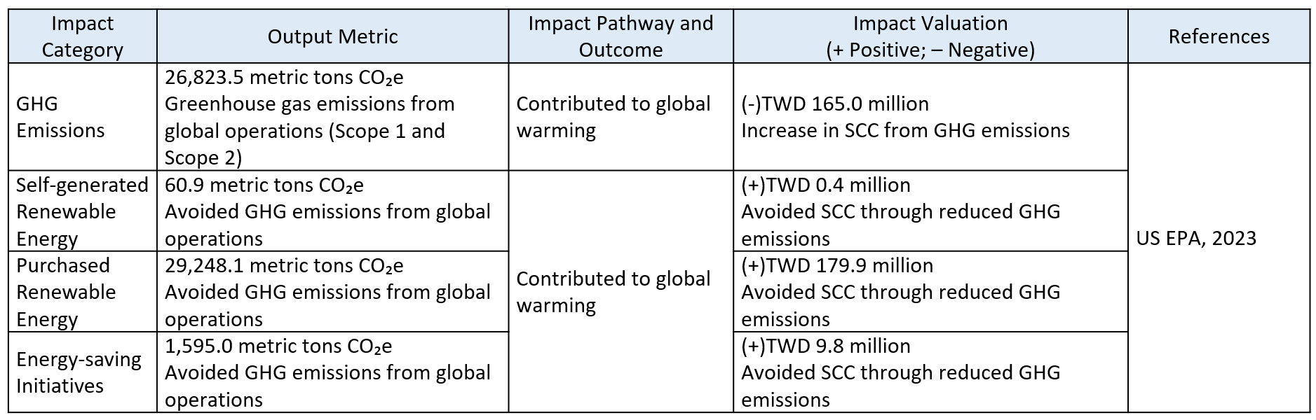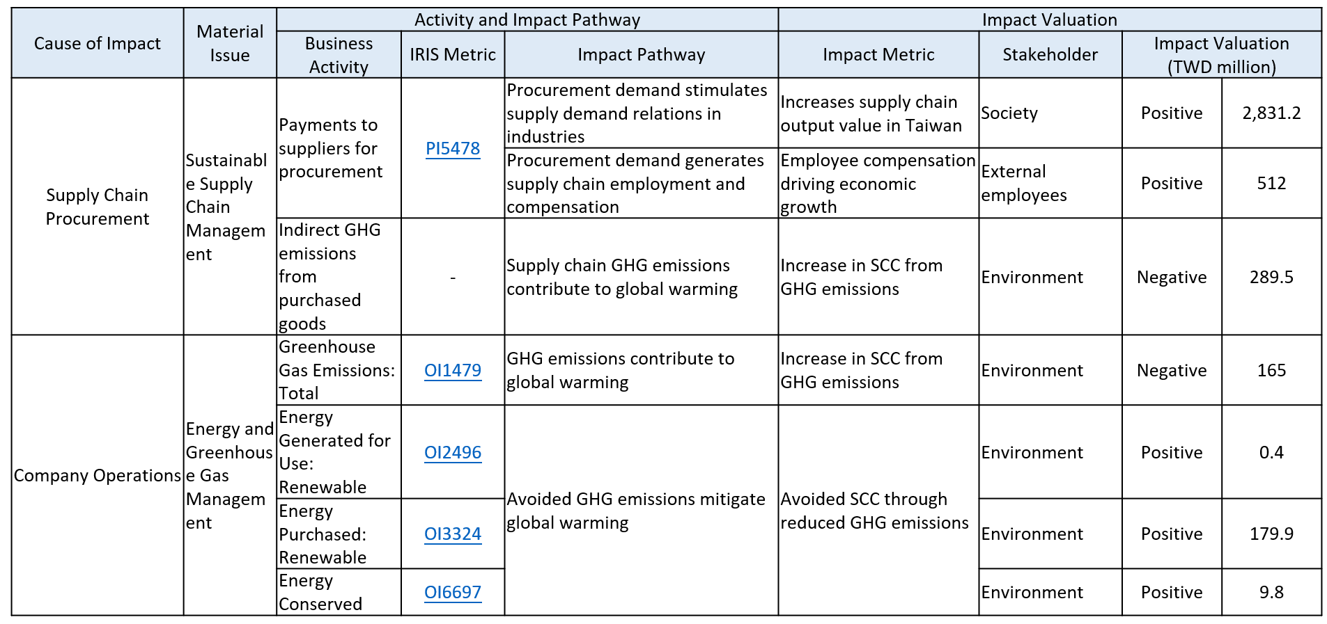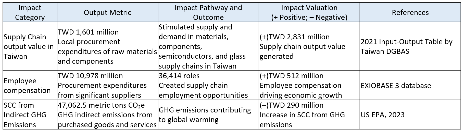In 2024, E Ink adopted the “Domestic Interindustry Linkage Table” published by Taiwan’s Directorate General of Budget, Accounting and Statistics (DGBAS, 2021), combined with the EXIOBASE 3 databaseNote 1, applying the Input-Output Model to conduct quantitative analysis. This assessment evaluates supply chain output value, employment, and employee compensation generated by the Company’s supply chain procurement expenditures. In addition, the social cost of carbon (SCC) Note 2 was used to estimate the environment impacts of indirect greenhouse gas emissions resulting from the procurement of goods and services. The analysis results serve as a critical reference for E Ink’s future risk management and strategic planning, supporting deeper sustainable partnerships with suppliers to jointly reduce potential impacts of the supply chain on stakeholders and the environment, while steadily progressing toward the goal of a “sustainable and value-added supply chain.”