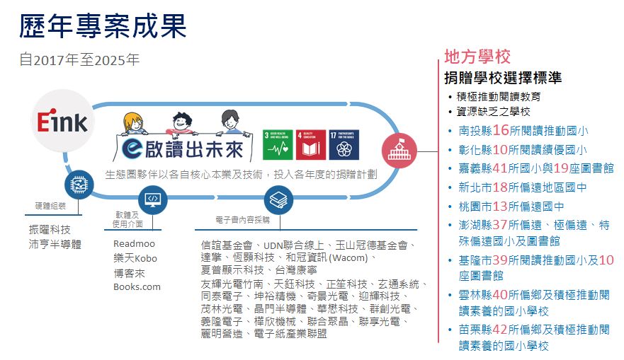專案依各廠區所在地,攜手在地的生態圈夥伴共同投入資源,將電子書閱讀器行動圖書館帶進校園,以數位閱讀資源協助學童培養閱讀素養,讓學童能在書籍中獲得豐富的知識,並從中開闊自身視野帶來新的啟發。
