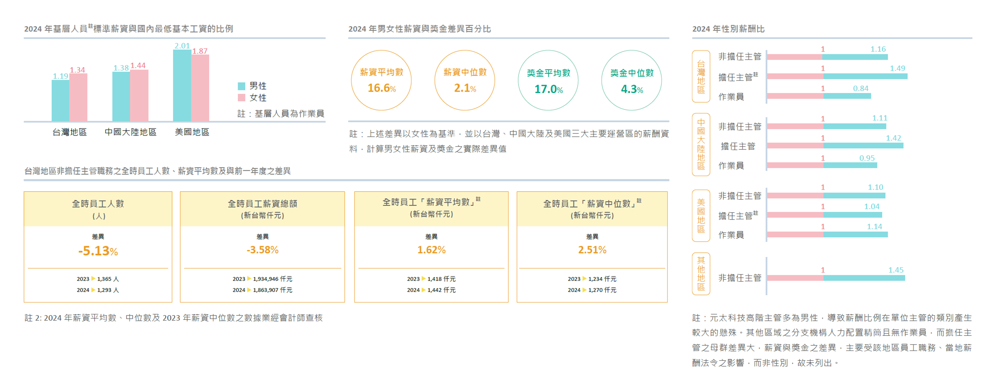 元太科技視員工為公司最重要的資產,提供每一位員工良好的工作環境,並依全球人力發展策略制定具競爭力的薪酬政策。以台灣地區為例,根據證交所公開資訊觀測站2024 年資訊,元太科技不論在整體薪資福利,或非主管全時員工之平均薪資等指標上,皆已位居上櫃光電業第一名及上市櫃光電業前3%之水準。元太科技之平均員工福利費用由新台幣1,681仟元增至新台幣1,718仟元。高於上市櫃光電同業之平均水準約53%。對於其他據點,元太科技以集團式、一致性的思維做為薪資福利管理之準則,持守公司之薪酬政策,同時,因地制宜,提供全球員工合乎法令、公平且具競爭力之薪酬福利。