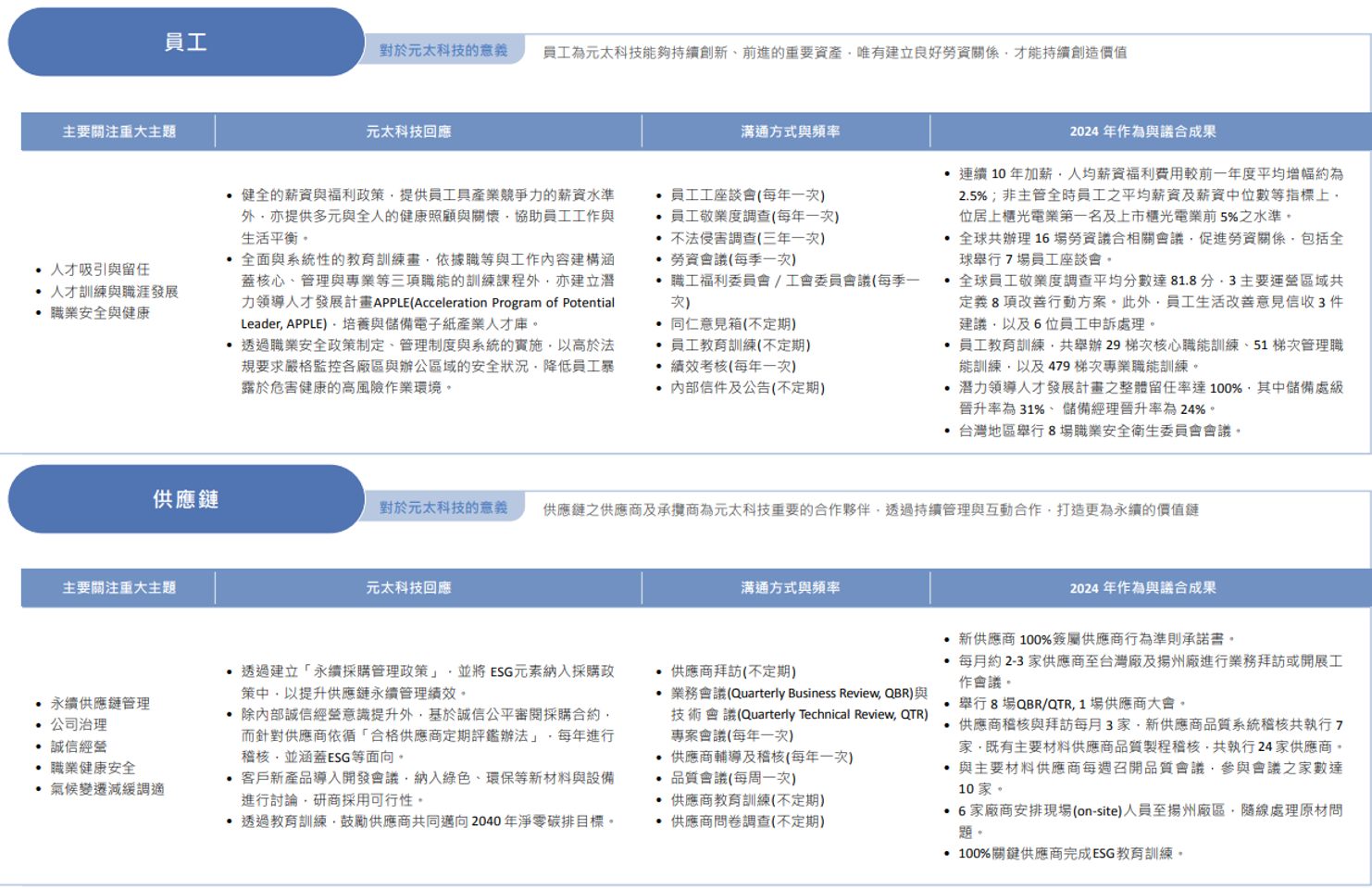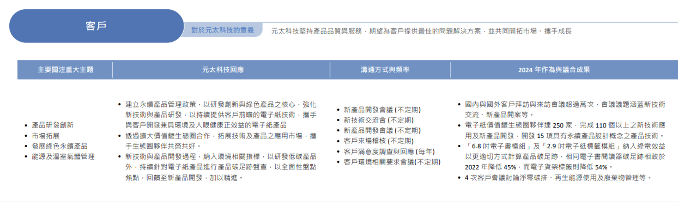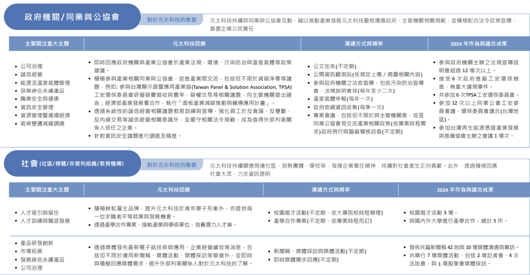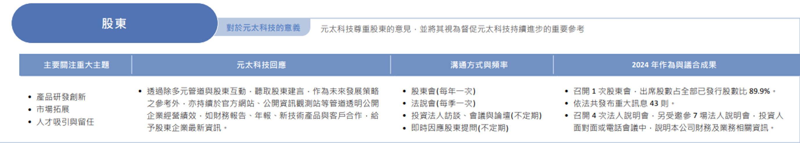 元太科技重視利害關係人的期待與需求,參考AA1000利害關係人議合標準(AA1000 Stakeholder Engagement Standard, AA1000 SES)的「責任、影響力、關注度、多元觀點、依賴性」五大原則,透過企業永續委員會召集各部門代表,鑑別出6類主要的利害關係人,包括客戶、員工、供應鏈、政府機關/同業與公協會、社會(社區/媒體/非營利組織/教育機構)與股東 。
