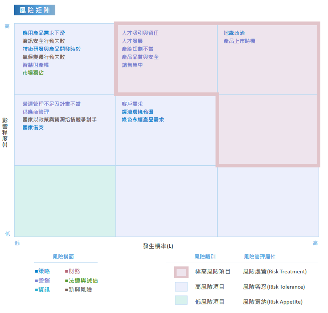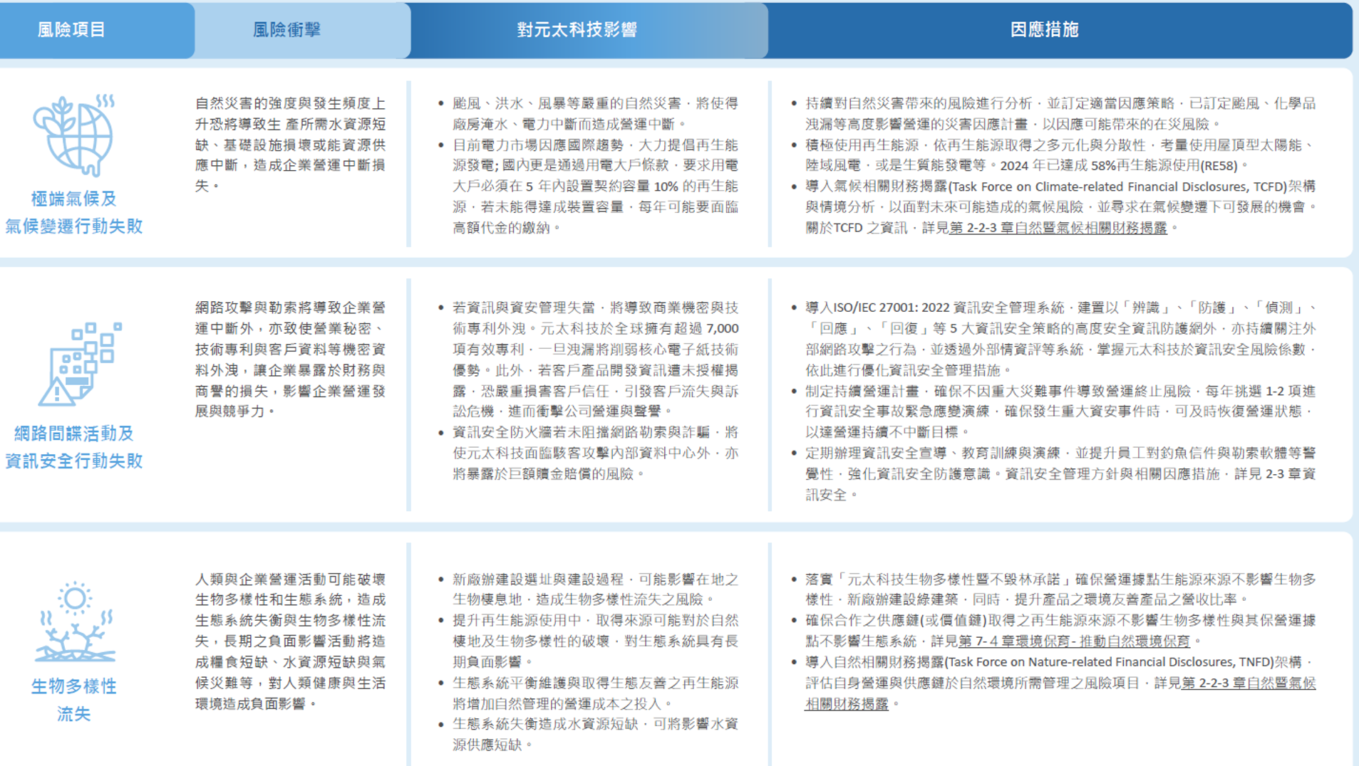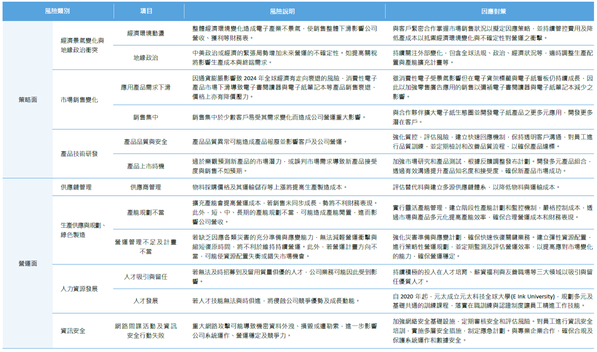 元太科技於2022年經董事會通過「風險管理政策與程序」,設置隸屬董事會之「永續發展委員會」進行風險管理相關運作機制之監督並將風險管理相關提議案交由董事會決議。定期(至少一年一次)彙整並提報公司風險管理執行情形報告。2025年董事長(永續發展委員會最高主管)向董事會共報告一次風險管理執行情形內容包含各面向風險評估結果,並針對風險較高的面向說明控制及監督程序。